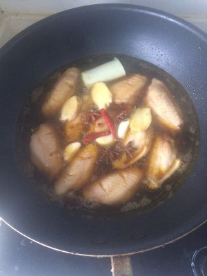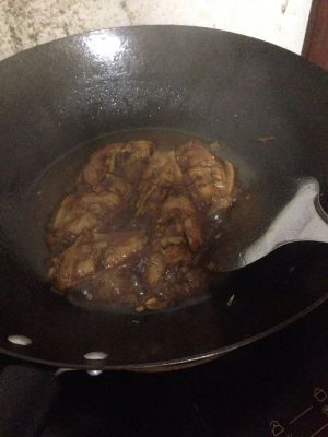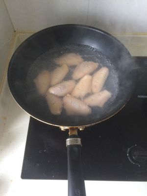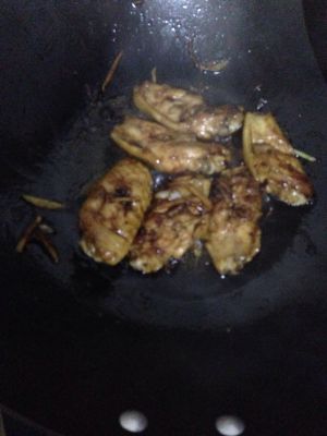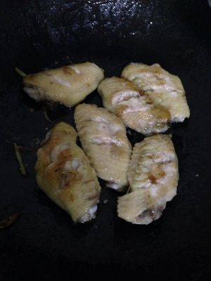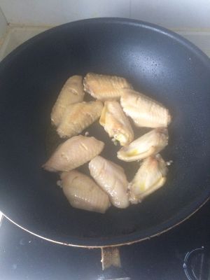 锅中倒入少量花生油,油半开后倒入鸡翅在锅中小火煎至微黄,(两面都分别煎黄)