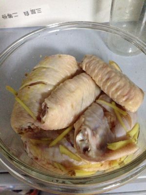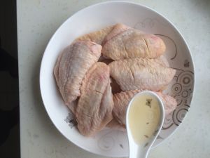 鸡翅洗干净,分别在两边划两刀好入味,在碗里放入切好的姜丝,料酒,盐与鸡翅拌一下,腌制十五分钟。