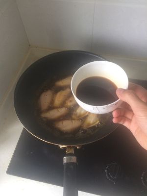 鸡翅煎黄后倒入姜丝大蒜翻炒出香味,倒入生抽和老抽稍微炒一分钟。