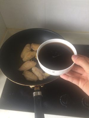 倒入可乐,可乐的量根据鸡翅确定,只要盖过鸡翅就行。