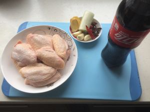 鸡翅洗净,葱切段,姜切片,可乐选用可口可乐。
