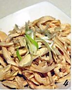 煮熟的鸡大胸用凉水冲干净沫子,用手沿着肉纹理撕成5mm内的细条