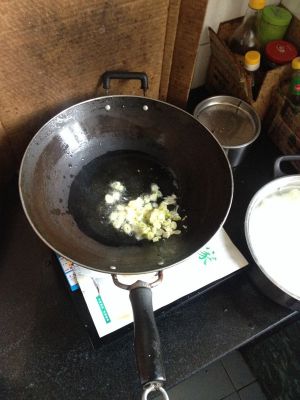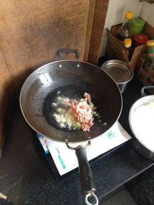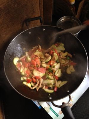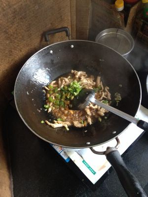 炒至八分熟,就下黑椒酱,盐,味精,加一点点水继续翻炒。