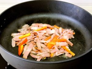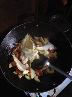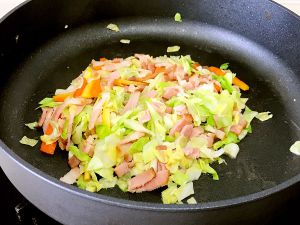 加入卷心菜一起炒,不用加盐,培根已有咸味