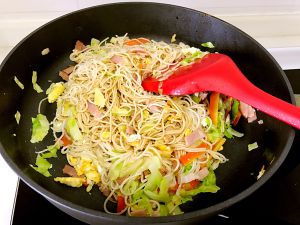 这一步忘记拍照就用文字说明,把熟面倒进炒好的配料里,再一点点酱油。继续翻炒5分钟左右。因为是买的是熟面所以不用炒那么久。