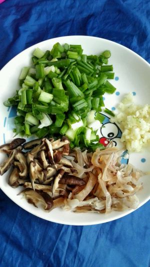 把鱿鱼干,香菇,葱,蒜,都一样切好,香菇记得用热水泡一下比较软好切