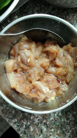 肉丝用糖,鸡精,少量酱油拌匀备用。