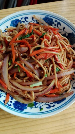 洋葱 胡萝卜 五花肉 都切丝,锅洗净油热后先把切好五花肉放入锅中翻炒致变色,再加入洋葱胡萝卜一起翻炒,洒少许盐,待胡萝卜变软时加入圆面条翻炒,加少许盐和酱,翻炒均匀后出锅!