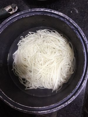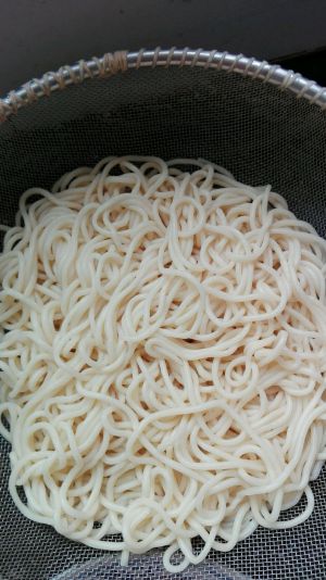 圆面条过水,后捞起,放入冷水中,在沥干水分,可以弄点油,免得粘一起了