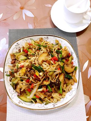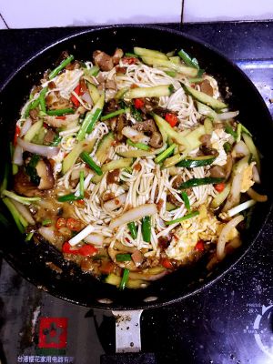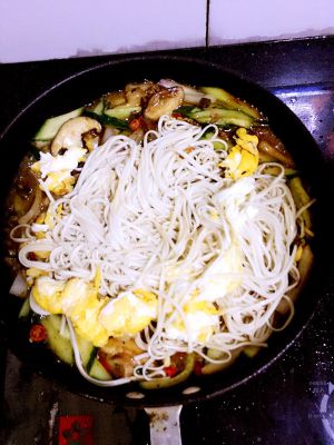 放入黄瓜丝,洋葱丝,鸡蛋,面条一起翻炒,放入盐,海鲜酱油,辣椒酱一起翻炒,再放入一点老抽上色