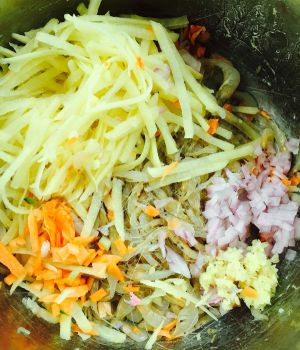 江虾洗干净控干水分,加入胡萝卜,土豆丝,葱姜