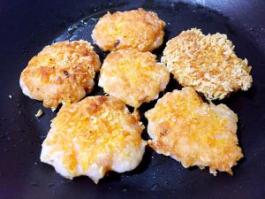 从冰箱中拿出,沾少许蛋液,再裹上面包屑。