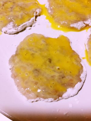 将泥按成饼状,两面沾上少许淀粉。放入冰箱冷冻5分钟。便于成形。