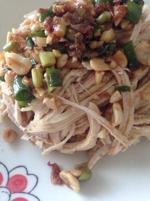 把熟花生仁拍扁切碎,放在鸡丝上;(花生仁要用熟的,烤的、炸的都可以,熟花生仁才比较香)