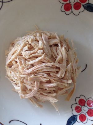 煮好的鸡肉放凉一下,用擀面杖敲打一会儿,把肉拍散,然后用手撕成细丝;(煮鸡胸肉的时候不需要煮太久,用筷子插一下鸡肉中间,很轻松就插进去,而且不出血水就可以了)