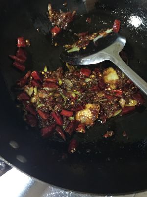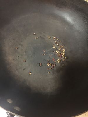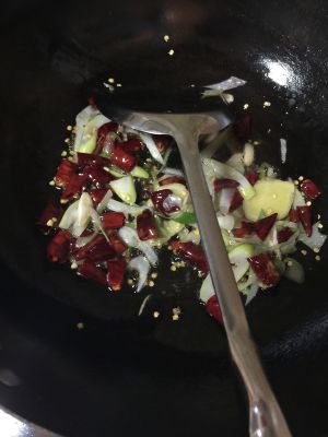 锅中倒油 可以稍微多一点点 小火炸辣椒 和一勺花椒 然后倒入葱姜蒜爆香
