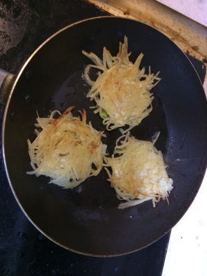 土豆洗净备用,把土豆擦成丝,把面粉拌入土豆丝中,加少许盐,饼铛预热放入饼铛烙至两面金黄即可。