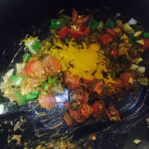 加入小番茄(稍微压扁一下)和咖喱粉翻炒