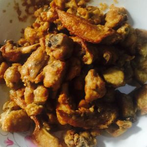 鸡肉在锅中炸至金黄后捞出备用