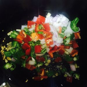 锅里加少许油,先放入蒜和姜炒至金黄,加入辣椒洋葱翻炒