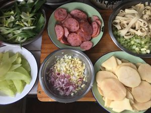 首先把所有材料洗干净,土豆、火腿肠、莴笋等切片。豆腐皮切条,芹菜,葱姜蒜洋葱切丁。