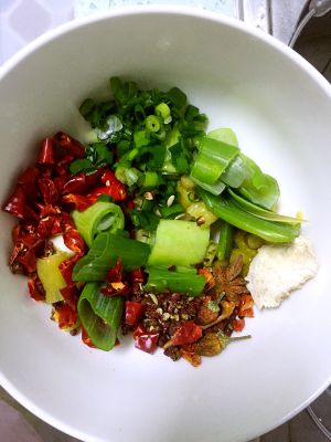 葱切小段,干辣椒,干花椒,八角,小茴香,香叶,凉姜,米酒少许,小米椒切碎,泡椒切段,泡椒和小米椒适量放,根据个人口味,但不能没有