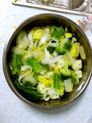 所有食材都准备好以后,按照先素后荤的顺序焯水。焯完水沥干水分备用