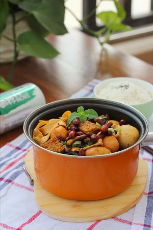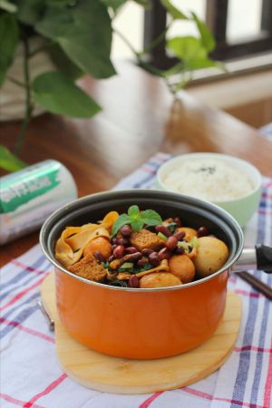 变色之后倒入腐竹、面筋、豆皮、海带,翻炒变色之后,最后倒入青菜,放一点盐即可出锅。为什么要放一点盐呢?其实火锅底料也是咸咸的