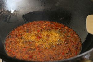开始炒料,国内少放点油,姜片以及刚准备好的那些调料小火炒出香味,放一些白糖,倒入两大勺郫县豆瓣,两勺黄豆酱炒香,加一点料酒,再放入火锅底料,等待底料融开,翻炒出香味