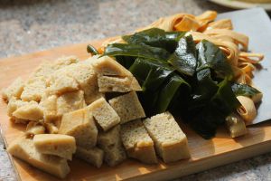 海带、豆皮根据个人喜好切宽片或者细丝。面筋切块,腐竹提前浸泡好