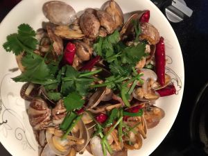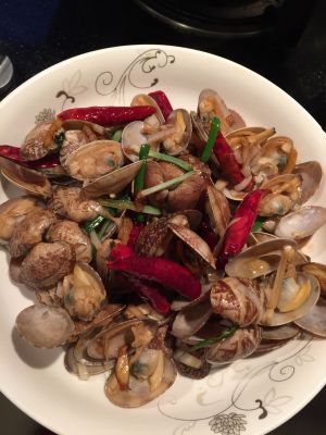 锅中放入食用油,加入姜蒜和青椒末翻炒片刻,倒入花蛤,不停的翻炒至开壳,大约3-4分钟,随后加入蚝油和黄豆酱及料酒,待料炒制均匀后加入葱末,出锅!