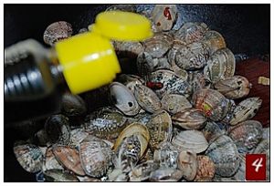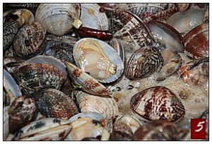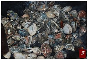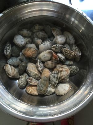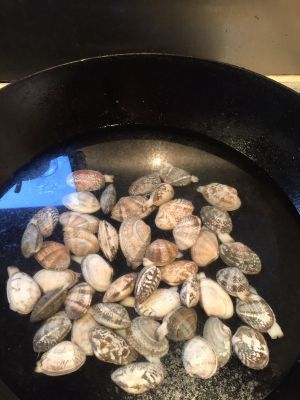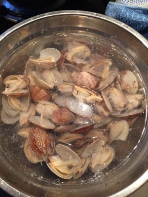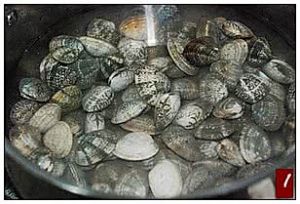鍋裝冷水,慢慢燒開等花蛤開口,一個個夾出來放入裝滿冷水的盤中,沖洗乾淨裏面的沙土(多洗幾次,就是盤底的泥土)