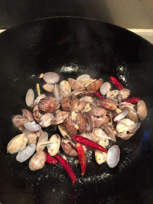 大火炒,花蛤会慢慢张开壳子,颜色慢慢变红
