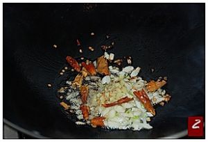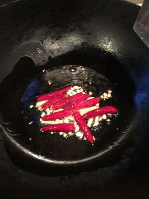 锅中放油烧热,放入葱、姜蒜、干辣椒炒香。