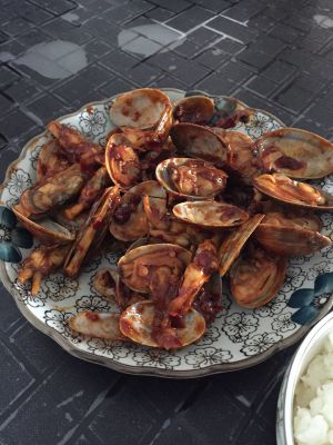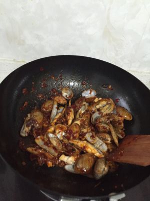 锅里先用葱姜蒜爆锅,再加入郫县豆瓣酱(稍微少加点水稀释一下,免的糊锅),最后倒入花蛤或者蛏子,炒到它们都开口^.^