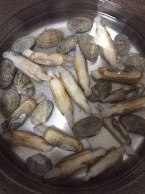 热锅放水烧开,帮花蛤放入热水中,为了是让花蛤开口去沙子,我个人觉得这样很方便。
