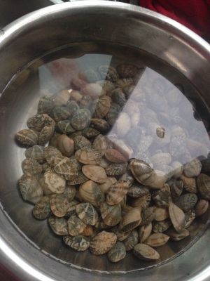 花蛤买回泡在加点盐的清水中,用牙刷把壳上的脏东西都刷干净~~刷的手抽筋……,养半天让花蛤吐吐沙