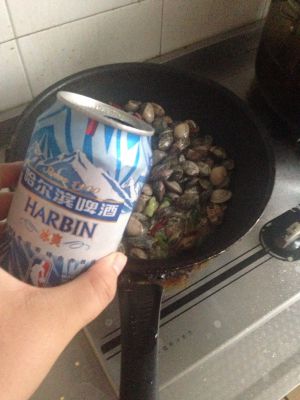 葱姜蒜干辣椒爆锅,放入花蛤翻炒,然后盖盖儿闷。