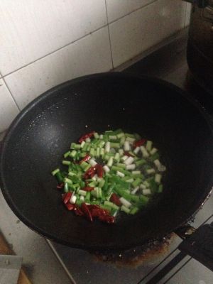 热油热锅,倒入葱花辣椒翻炒爆香