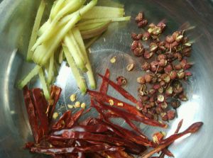 姜切丝,干辣椒剪成丝,花椒放置盘中备用