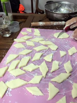 面团上下垫上保鲜膜后,擀成薄面皮,用刀和尺子切成4厘米左右的正方形