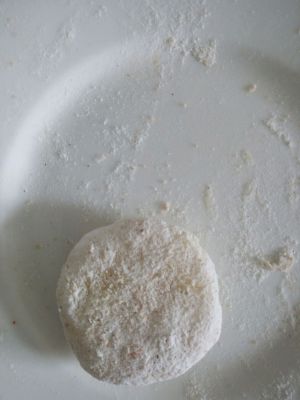 捏成饼状,裹一下面粉。我在面粉里面加了一点辣椒粉。