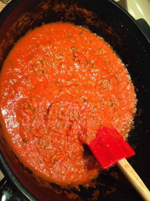 倒入意大利面番茄酱跟肉混合,然后煮开了换成小火煮10几分钟,中途记得翻锅。关于意面酱瓶装现成的味道有很多,如果你有时间的话可以自制,可以参考我的另一篇意大利面酱-基础原味版