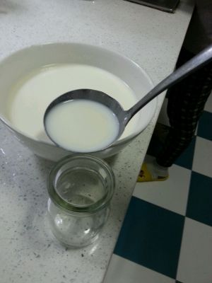 倒入盆中,等它晾到有一点点温度,注意温度高的话会把酸奶的菌群破坏,但是太凉也不利于发酵。