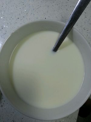取过了热水的盆子,倒入半瓶牛奶,加入半包菌粉(500ml牛奶就加半包0.5g菌粉,1000ml牛奶就加一包1g菌粉)搅拌至菌粉融化,再倒入剩下的一盒半牛奶。再加入20g细砂糖搅拌至细砂糖融化。
