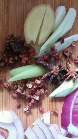 摆上葱姜、洋葱、蒜
