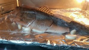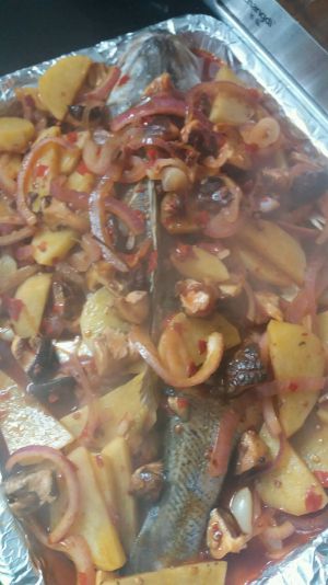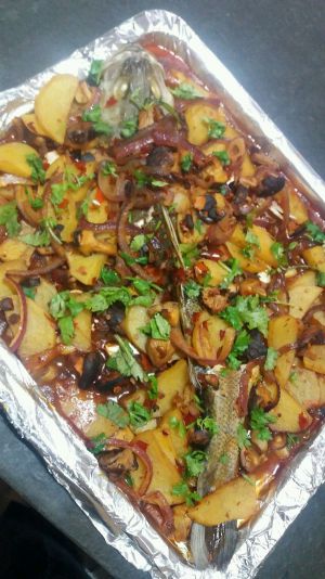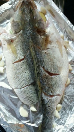 把鱼劈开,放入料酒,生姜,和生抽,腌制半小时(腌制鱼的过程中把所有配菜清洗干净,焯水),放入铺了洋葱和生姜的烤盘,刷一层油,中层,上下火200度,烤10分钟,取出撒上辣椒花椒和孜然粉,再在撒好的粉上滴上适量油,继续烤15分钟。