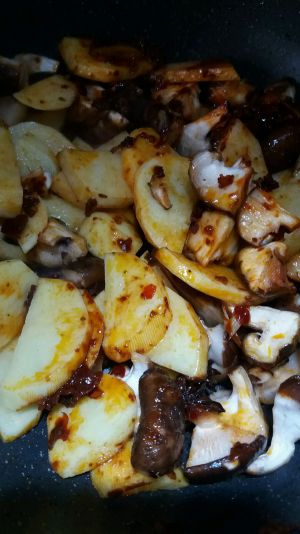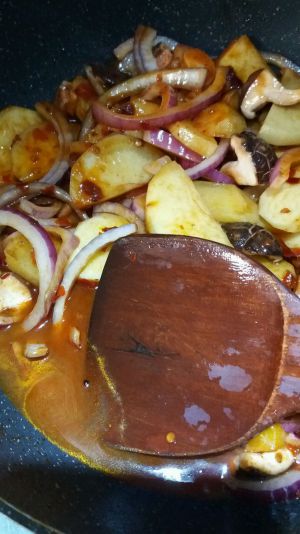锅放油,炸小料,郫县豆瓣酱用油炸香,按顺序放,土豆,香菇,炒一小会放洋葱