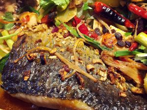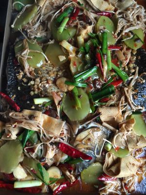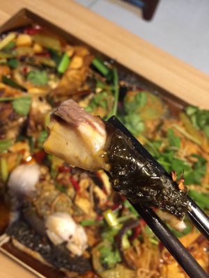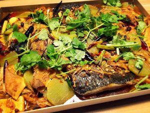 再将备好的虾、芹菜、菌类、豆芽、煮熟的手擀粉倒入锅中翻炒,加盐,少许糖,加一点水微炖2~3分钟至土豆绵软。起锅,将全部内容包括汤汁倒在烤鱼上,撒孜然。再入烤箱上下火200度5分钟。