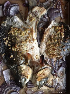 腌制鱼,将鱼一分为二,鱼身切几道口子,将盐、姜末、料酒、生抽、洋葱丝、孜然均匀涂抹在鱼身正反面,腌制1小时。入烤箱上下火230度20分钟。补充:锡纸容易破损误食,所以入烤箱前我还是撤掉了锡纸。